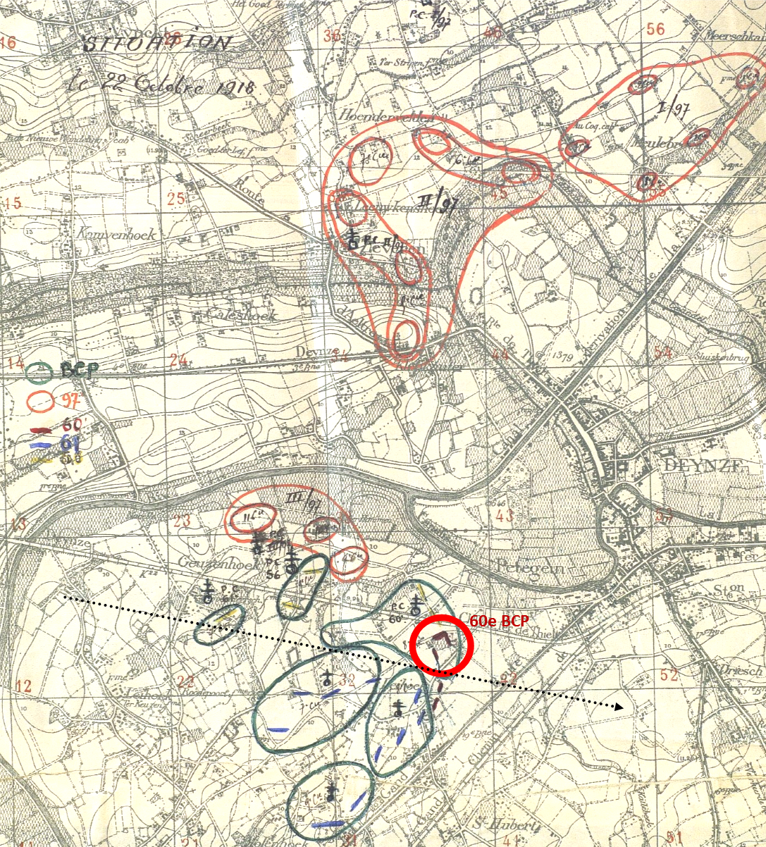 Dans la nuit précédant l’attaque, le 60e BCP franchis la Lys et établit sa base de départ. A 5 h 50, il s’élance pour son ultime assaut, à 6 h 50 les allemands ripostent avez des gaz (ypérite), 7 h 15 premiers prisonniers, 11 h 00 le 60e BCP atteint la voie ferrée de Gand et garde sa position dans des maisons à l’ouest de Petegen… à la fin de la journée son nom est inscrit dans la liste des pertes du JMO (22 morts, 49 blessés et 8 disparus).
