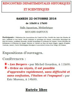 Une conférence le matin sur les Bergers par Michel Gourdon qui nous a promenés dans le haut pays et une l’après-midi sur l’apprentissage facile et rapide de l’italien et l’espagnol à partir du Niçois, par Eric Moreau.