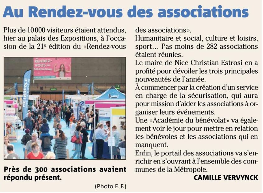 Le mois de septembre est pour l’ensemble du monde associatif un moment clé pour nos activités. Comme dans beaucoup de communes la ville de Nice a organisé son événement de rentrée : le Rendez-vous des associations. Le samedi 16 septembre, le palais des Expositions est devenu le temple de la vie associative niçoise avec près de 300 stands et plus de 10 000 visiteurs.